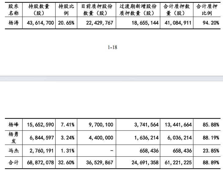 再次,大股东继续股份质押的融资方式也不再可行。截至目前,作为持股比例最多的实控人,杨涛持有公司股份的比例达20.65%,其中94%已被质押,另两名实控人也将手中近90%的股份做了质押。